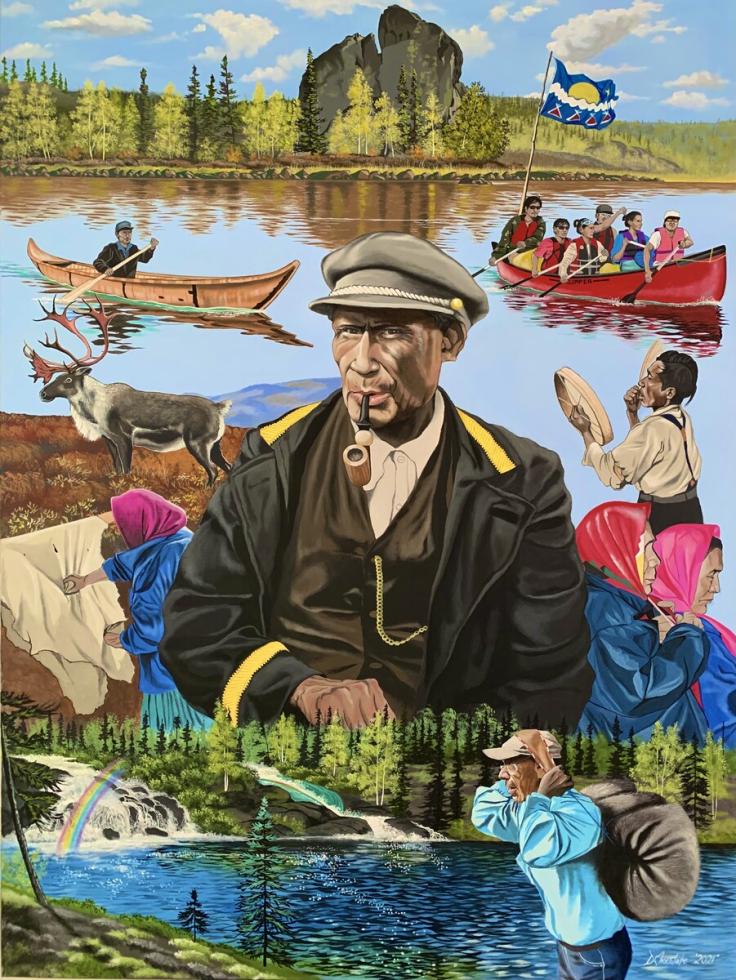 Darrell is originally from the Tlicho community of Gameti, Northwest Territories. In 2005, he got a job at a diamond mine and moved to Yellowknife, where he now resides with his wife and children. Darrell is a self-taught painter who paints from his office at home when he isn’t at work. He sells his artwork privately and does commissioned pieces upon request. In 2019, Darrell was awarded the Northwestel phone book cover.