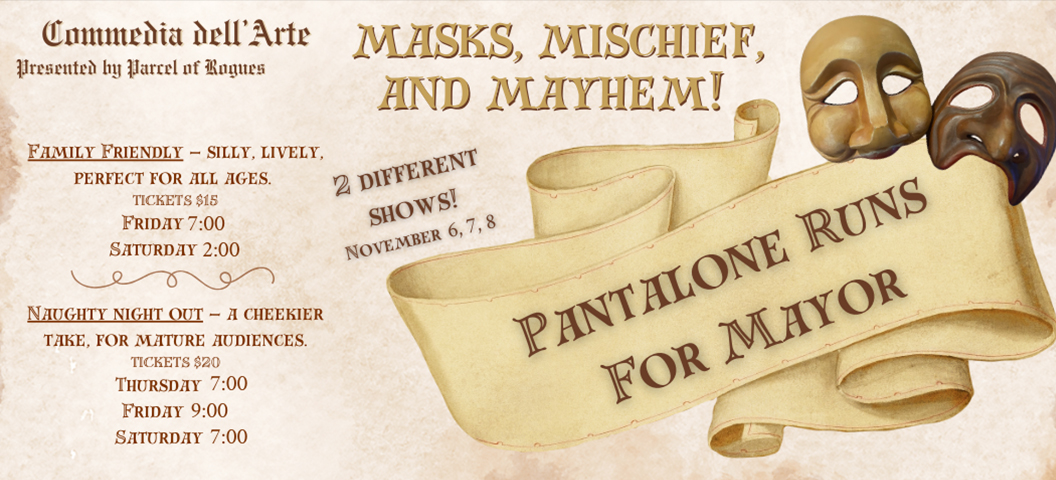 PANTELONE RUNS FOR MAYOR!A Commedia dell’Arte Spectacle Commedia dell’Arte, a form of improvisational theatre that relies on stock-characters, slapstick humour costumes, props and masks, is coming to NACC! Something strange is happening in town… The mayor’s gone, the power vacuum is pulling in all the usual suspects, and ambition, greed, and sheer stupidity are on the rise....