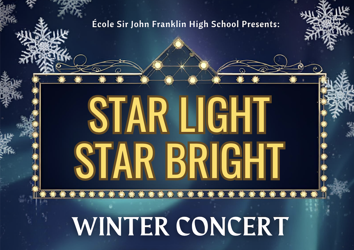 Ecole Sir John Franklin High School's Drama Department proudly presents...Star Light Star Bright Our musical Stars will be shining brightly as we play and sing themes from popular movies like Star Wars, Raiders of the Lost Ark, Pocahontas and the Incredibles.  This concert will feature the Sir John Fiddlers in their debut performance.   Admission by donation...